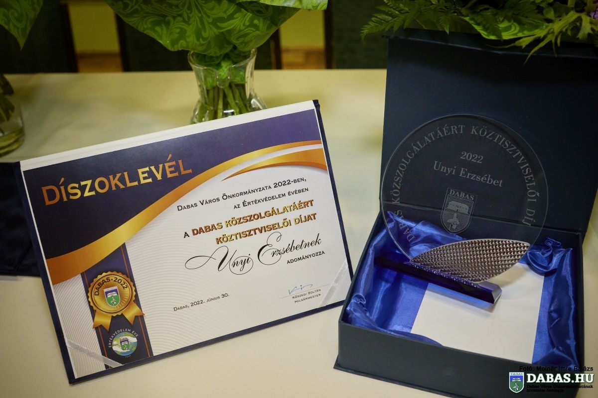 Átadásra került a Dabas Közszolgálatáért Köztisztviselői díj is, amit idén Unyi Erzsébetnek ítélt oda a képviselő-testület.