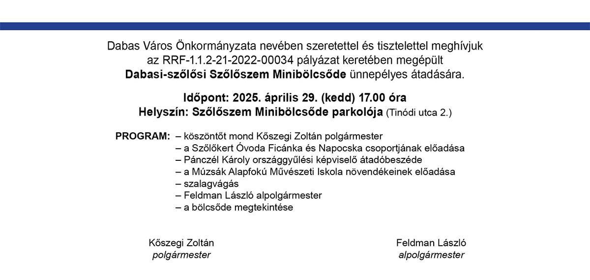 Dabas Város Önkormányzata nevében szeretettel és tisztelettel meghívjuk az RRF-1.1.2-21-2022-00034 pályázat keretében megépült Dabasi-szőlősi Szőlőszem Minibölcsőde ünnepélyes átadására.