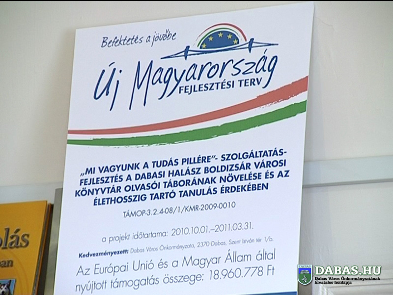 Dabas Város Önkormányzata (2370 Dabas, Szent István tér 1/b), mint kedvezményezett a Halász Boldizsár Városi Könyvtár szolgáltatásaink fejlesztésére a fenti pályázati konstrukció keretében 18 960 778 Ft támogatást nyert. A projekt az Európai Unió támogatásával az Európai Szociális Alap társfinanszírozásával valósul meg. A projekt időtartama: 2010. 10. 01.-2011.03-31.
