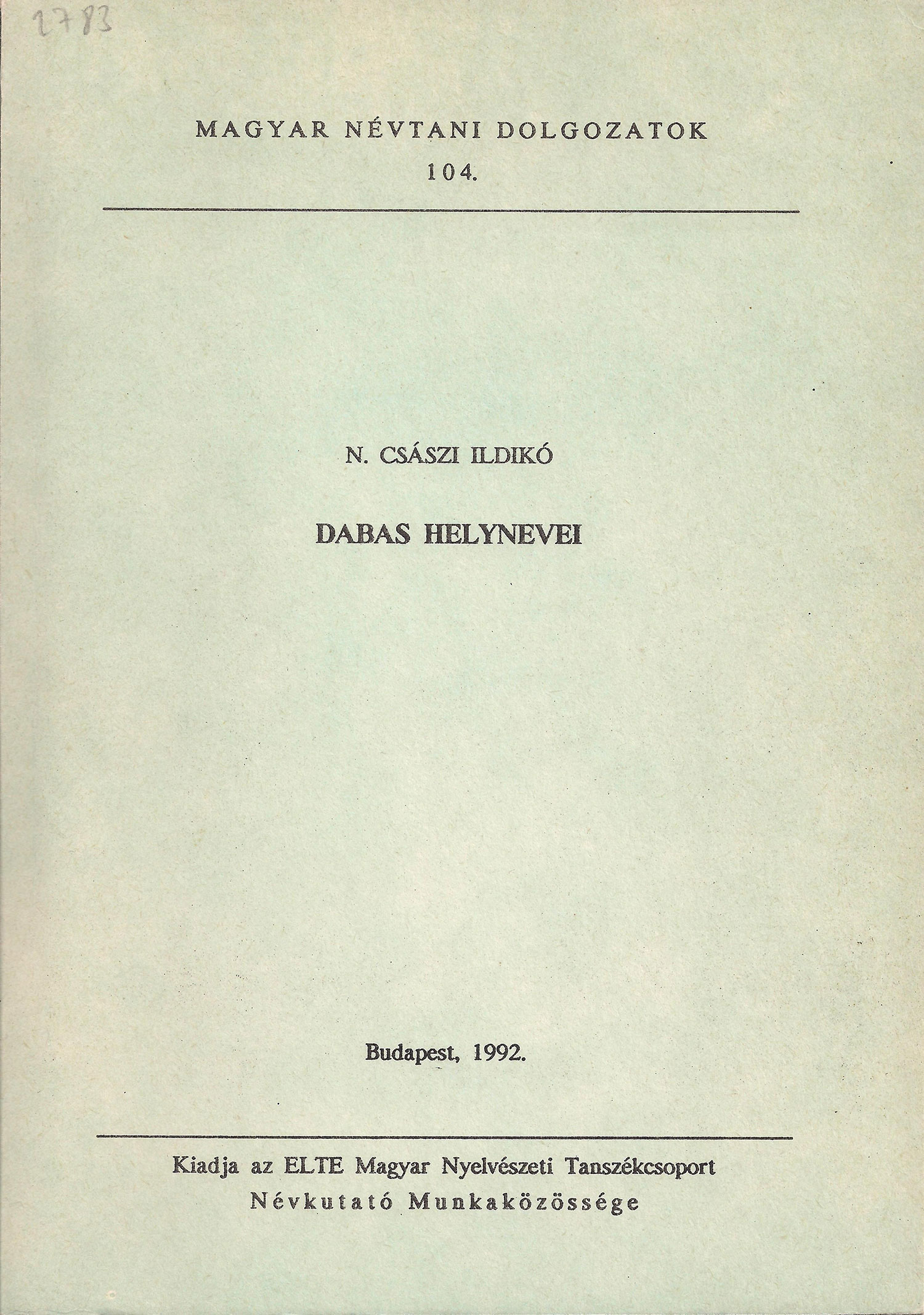 A „Dabas helynevei” című névtani dolgozat Budapesten, 1992-ben, a Magyar Névtani Dolgozatok sorozat 104. tanulmányaként jelent meg, kiadója az ELTE Magyar Nyelvészeti Tanszékcsoport Névkutató Munkaközössége, anyagi támogatója Dabas Város Önkormányzata. (A közkeletű nevén „kék füzetek”sorozatban 1976-2006 között összesen 200 szám jelent meg, a programot koordináló Hajdú Mihály (1933-2014), nyelvész, az MTA doktora szerkesztésében.)