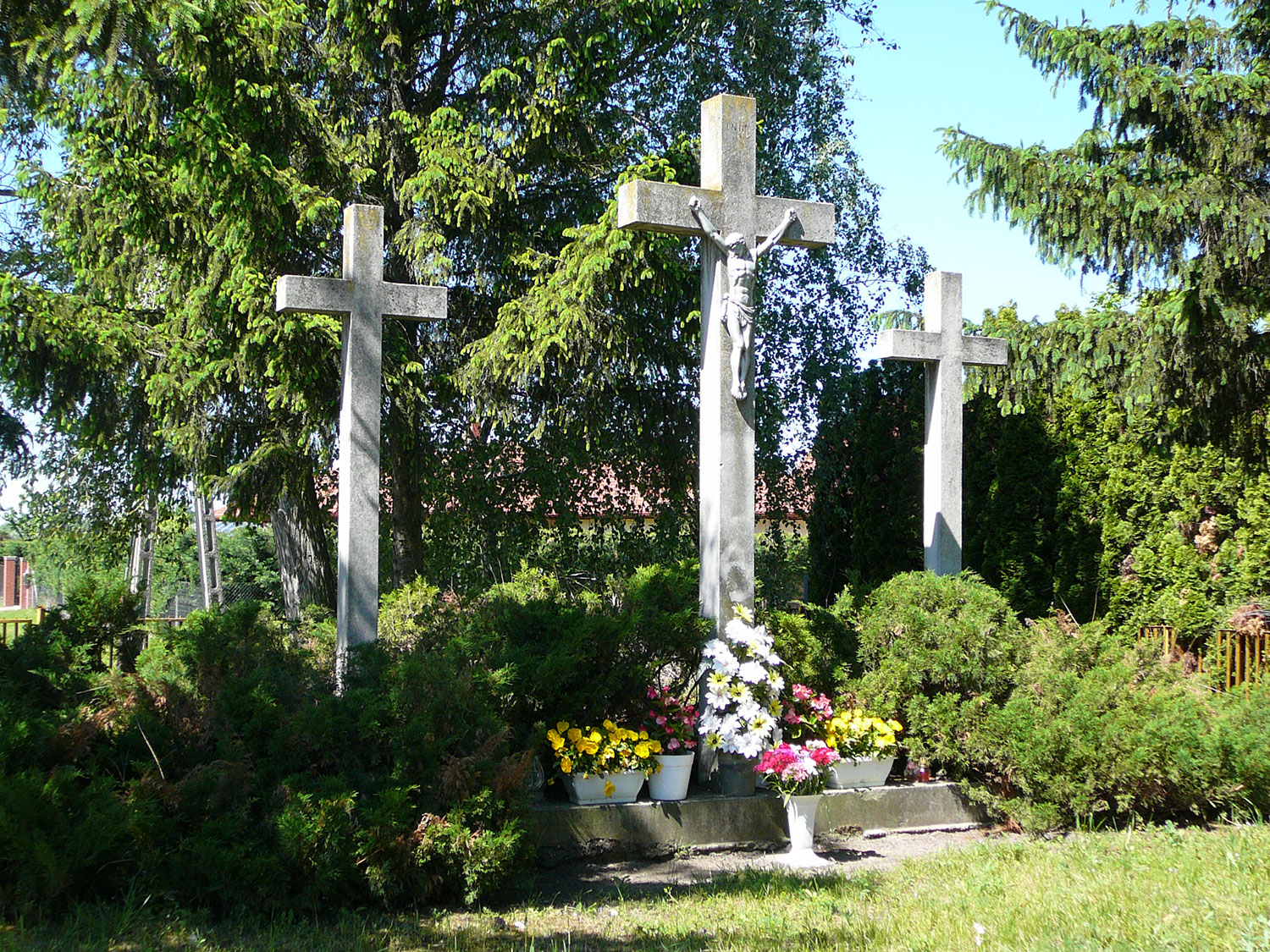 Ezen 100 □ ölhöz a község képviselő testülete és elöljárósága a szomszéd határos közútból még másfél öl szélességű területet csatolt. Új határárkot húzatott és a körül árkolt helyiséget a még buzgóbbjai kellőleg feltöltvén, a keresztek felállításához alkalmasabbá tették. 1879. aug. 12-én a keresztek fel is állítattak, de miután a hely még tökéletesen nem vala elrendezve, felszentelésük csak 1880-dik év tavaszán ment végbe a helybeli plébános által.”