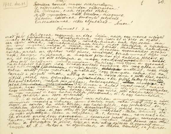 Kedves Testvéreim! Vándorok vagyunk az élet útján, akik egy messze világító czél felé haladunk. Némelyikünk már el is érte a czélt, mely felé bizakodva indult, némelyikünk csak kezdetén van az igazi útnak, némelyikünknek csak most kezdődik a küzdelem, az igazi munka, melyben a másik már ki fáradt. Haladunk, haladunk! Egymás után marad el mögöttünk az ártatlan gyermekkor virágos kertje, aztán az ifjúkor zöld füves, reménnyel, bizalommal teljes mezeje; lassan kijutunk a meglett férfikor ért, kalászos földjére és az út végén ott áll előttünk a maga csendjével, nyugalmával – a temető. Arrafelé haladunk mindannyian… Csakhogy, míg egyik a gyermek kaczagástól hangos üde virágos kertből egyszerre tér meg abba a sokkal csöndesebb virágos kertbe, anélkül, hogy örült volna a zöld füves mezőnek, anélkül, hogy learatta volna ért kalászait a sárguló rétnek, addig a másik végig járja e földi élet egész útját, részt vesz örömében, fájdalmában s ősz fejjel ballag be csendes pihenőhelyére. Melyik jár jobban, boldogabban, ne tűnődjünk most e felett. Ki ösmeri a halál rejtelmeit? Csak azt tudjuk, hogy minden nap közelebb visz hozzá, a rejtélyes ismeretlenhez, hogy minden nap, minden hónap lezár egy részt földi életünkből. Íme, a mai nappal is egy határkőhöz jutottunk, kedves testvéreim, egy határkőhöz, mely lezárja az 1902. esztendőt.