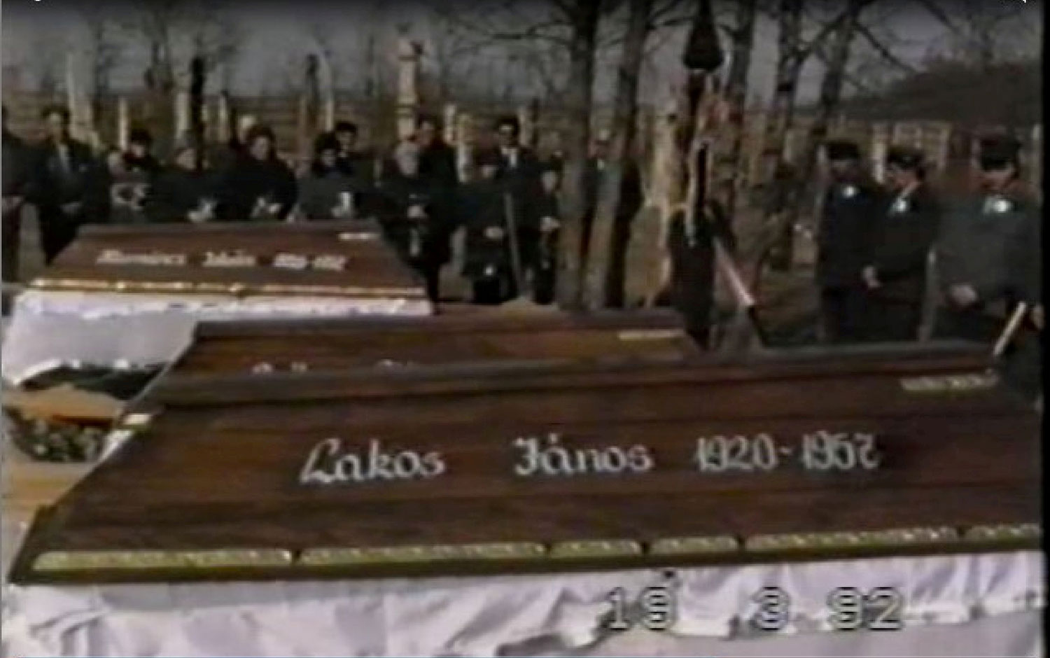 „Ennio Morricone jól ismert melódiája, „A halál dala” adja meg a 30 éves amatőr videó-összeállítás alaphangját és hangulatát, miközben Budapesten, a Rákoskeresztúri Új Köztemető ravatalozója előtt gyülekeznek a tisztelgők. Gyóniak, dabasiak és sáriak vegyesen, de legfőképpen mégiscsak a gyóniak, mert 1957. október 25-i kivégzésüket követően, azaz nagyon hosszú idő után három gyóni 1956-os mártírnak adják meg a végtisztességet.  A férfiak kabátján itt-ott kokárda díszlik.  Bent a teremben három egyformán felravatalozott koporsó várja őket, koszorúkkal övezve. A virágok tónusában a hófehér, az ártatlanság színe a meghatározó, de fehér a koporsók felirata is: Lakos János (1920-1957), Balla Pál (1919-1957) és Harmincz István (1928-1957). Az emelkedett hangulatban férfiarcon gurul végig az első könnycsepp, pedig még meg sem kezdődött a szertartás. Az ökumenikus szertartást három felekezet (római katolikus, evangélikus, református) lelkipásztorai vezetik, de a Történelmi Igazságtétel Bizottság képviselője is méltatja a mártírokat, kihangsúlyozva, hogy a bajtársak most már szabad földben, szabad hazában nyugodhatnak. A gyóniakat valamennyi helyi felekezet lelkésze elkísérte, közülük a szertartáson Barta Károly református tiszteletes szolgálatával is közreműködött. Az akkor 72 éves Bisztrai László (1920-2010) atya – aki három évet szenvedett Rákosi börtönében - és Koczor Tamás lelkész pedig személyes jelenlétükkel fejezték ki tiszteletüket. A még élő gyóni elítéltek közül Sziráki Istvánt, Harmincz Istvánt, Sasadi Viktort örökíti meg a kamera, de feltűnik Sári község egykori halálra ítéltje, Farkas Pál is, aki a rendszerváltás után Kanadából hazatelepült, és akit a gyóniak is csak „Karvaly”-ként ismertek. A tisztelgő családok szorosan egymás mellé állva erősítik egymást. A szolidaritás érzését jól mutatja, hogy nagy számban voltak jelen a gyászokban közvetlenül nem érintett családok tagjai is. A ravatalozó búcsúztatója az első stációja az újratemetésnek. A menetbe szerveződött gyászolók a köztemető harangjának szavára indultak el a távoli 301. parcella felé.