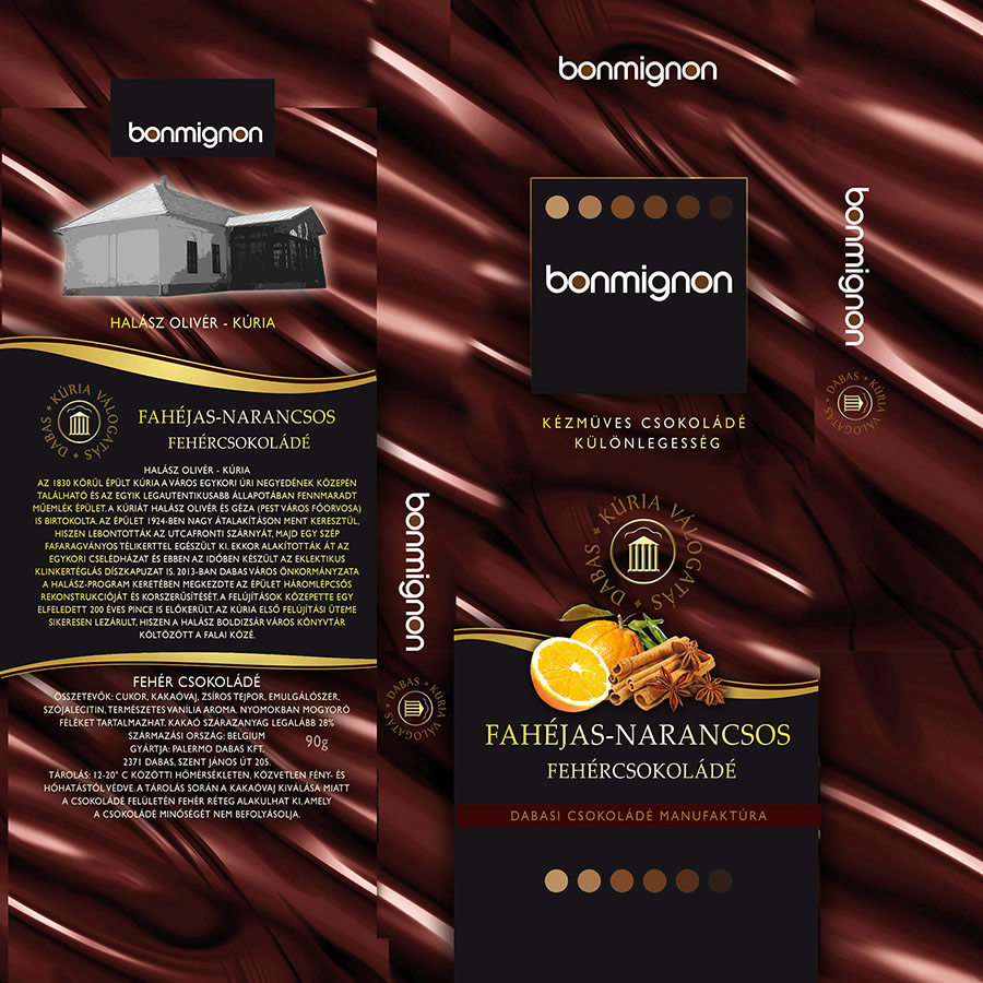 Fahéjas-narancsos fehércsokoládé: Csomagolásán a Halász Olivér-kúriát és leírását jeleníti meg: „Az 1830 körül épült kúria a város egykori úri negyedének közepén található és az egyik legautentikusabb állapotában fennmaradt műemlék épület. A kúriát Halász Olivér és Géza (Pest város főorvosa) is birtokolta. Az épület 1924-ben nagy átalakuláson ment keresztül, hiszen lebontották az utcafronti szárnyát, majd egy szép fafaragványos télikerttel egészült ki. Ekkor alakították át az egykori cselédházat és ebben az időben készült az eklektikus klinkertéglás díszkapuzat is. 2013-ban Dabas Város Önkormányzata a Halász-program keretében megkezdte az épület háromlépcsős rekonstrukcióját és korszerűsítését. A felújítások közepette egy elfeledett 200 éves pince is előkerült. A kúria első felújítási üteme sikeresen lezárult, hiszen a Halász Boldizsár Városi Könyvtár költözött a falai közé.”