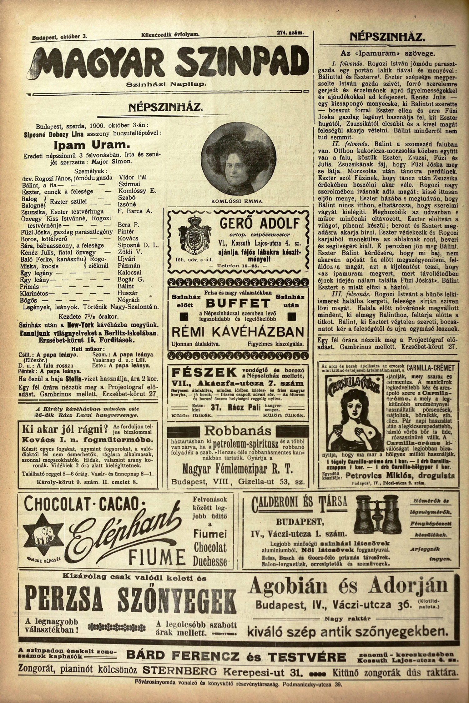 - Népszínház: Siposné Dobozy Lina asszony búcsúfelléptével: Ipam Uram. 1906. október 3. p. 8.