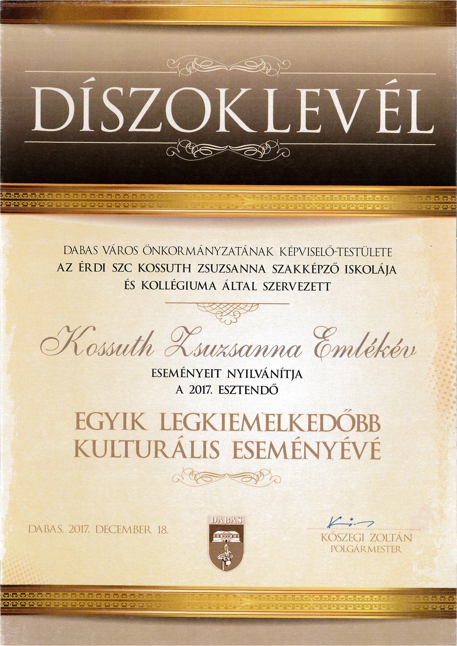 2017 decemberében Dabas Város Önkormányzata az iskolának ítélte „A 2017. év egyik legkiemelkedőbb kulturális eseménye Dabason" címet, melyet a városi rendezvényen vehettek át.