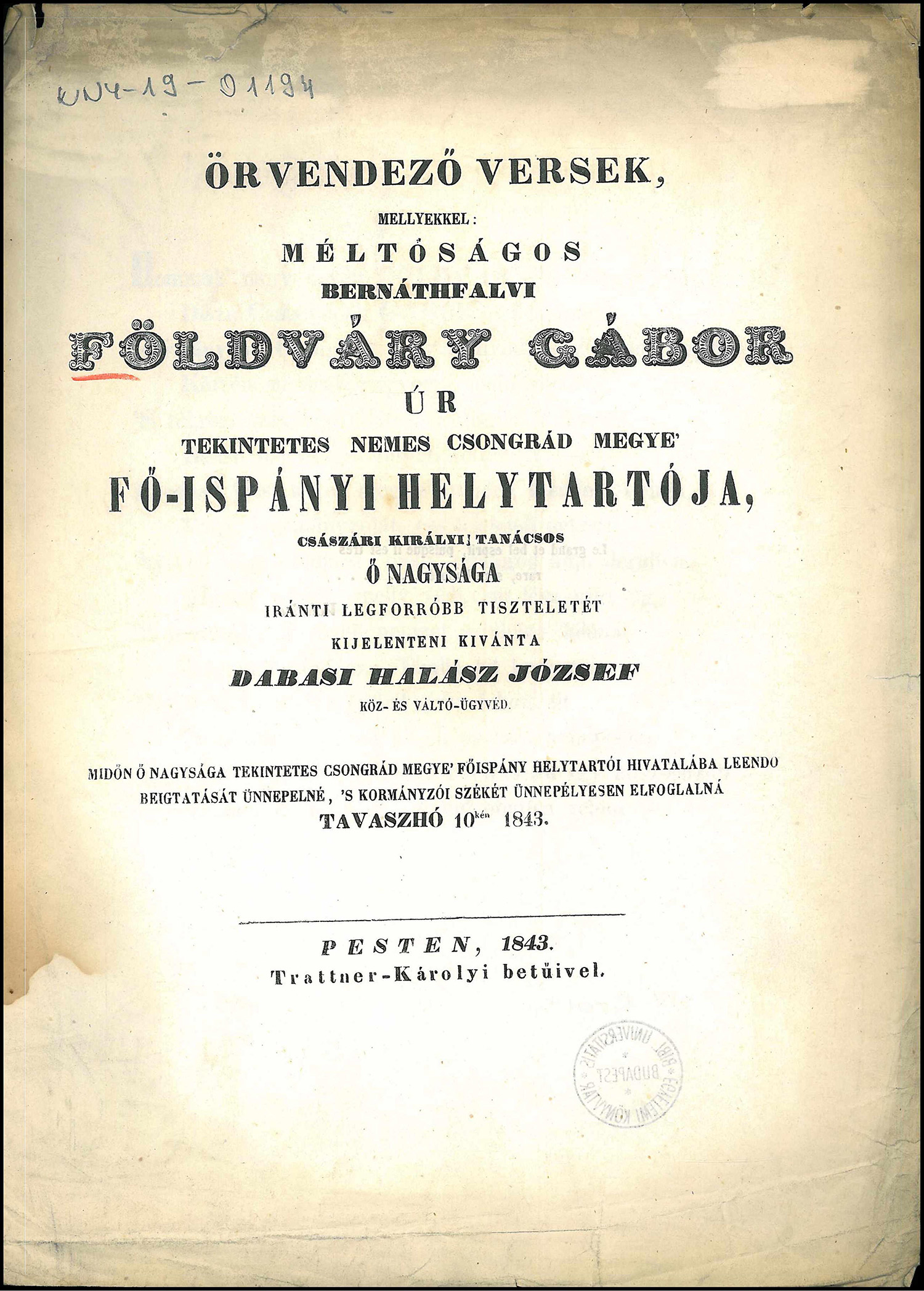 - Örvendező versek, melyekkel méltóságos bernáthfalvi Földváry Gábor úr tekintetes nemes Csongrád megye főispányi helytartója, császári királyi tanácsos ő nagysága iránti legforróbb tiszteletét kijelenteni kívánta Dabasi Halász József ... midőn ő nagysága ... Csongrád megye' főispány helytartói hivatalába leendő beigtatását ünnepelné, s' kormányzói székét ünnepélyesen elfoglalná Tavaszhó 10-kén 1843. Pesten, 1843, Trattner-Károlyi betűivel. 3. p.