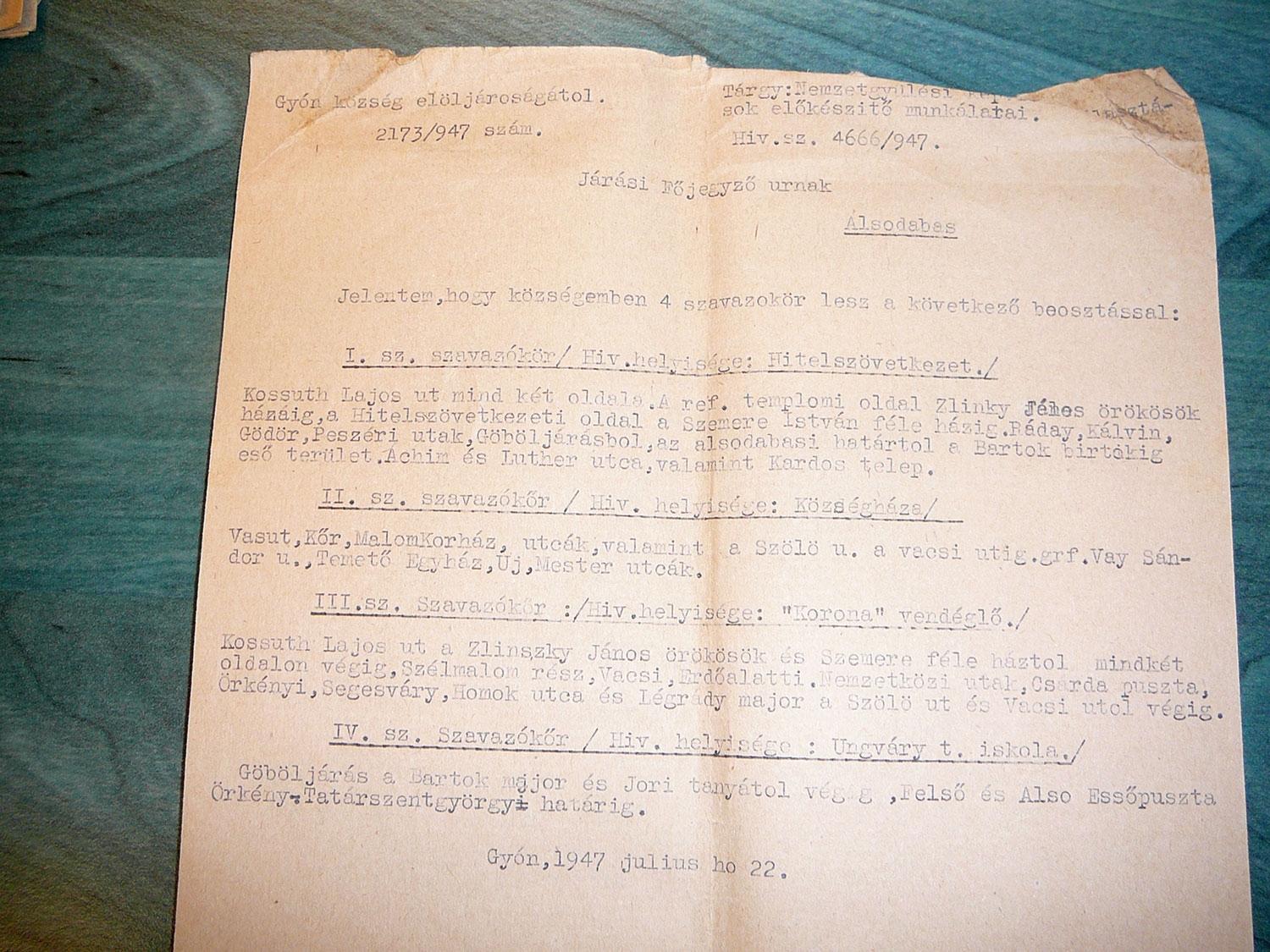 Alulírott községi jegyző ezennel hivatalosan bizonyítom, hogy Gyón község határában fekvő és annak közigazgatásához tartozó Göböly-járás puszta, mely jelenleg Unghváry László czeglédi szőlőbirtokos tulajdonában van, az anyaközségtől több, mint három /:3:/ km. távolságra esvén, meghaladja azon utat, melyet a gyermekek a minden-napi oktatás érdekében megtehetnek.